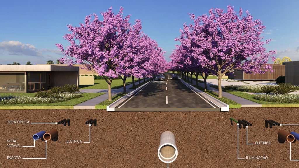 Solução sofisticada, amplamente adotada em empreendimentos de médio e alto padrão, a rede subterrânea realiza a distribuição de energia elétrica por meio de condutores instalados em eletrodutos e caixas de passagem, totalmente embutidos no solo.